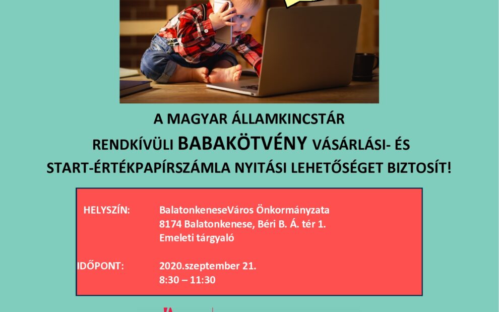 Babakötvény vásárlási- és Start értékpapírszámla nyitási lehetőség 2020. szeptember 21-én a Polgármesteri Hivatal emeleti tárgyalójában, a Magyar Államkincstár jóvoltából!