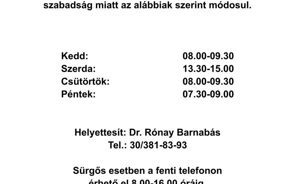 Tisztelt Kenesei Polgárok, Nyaralók! Dr. Németi Sándor e heti rendelése szabadság miatt változik. A helyettesítő orvos Dr. Rónay Barnabás az…