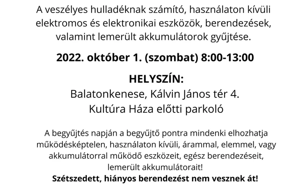 Időpont: 2022. október 1. (szombat) 8:00-13:00 Helyszín: Balatonkenese, Kálvin János tér (Kultúra Háza előtti parkoló) A gyűjtést végzi: FE-GROUP…