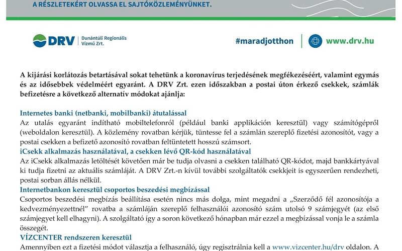 A DRV Zrt. tájékoztatása az elektronikus számla fizetési lehetőségekről