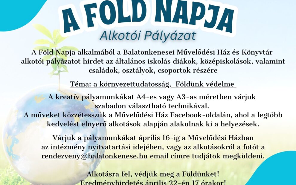 A Balatonkenesei Művelődési Ház és Könyvtár alkotói pályázatot hirdet a Föld Napja alkalmából! Várjuk az általános iskolásokat, középiskolásokat, valamint családok,…