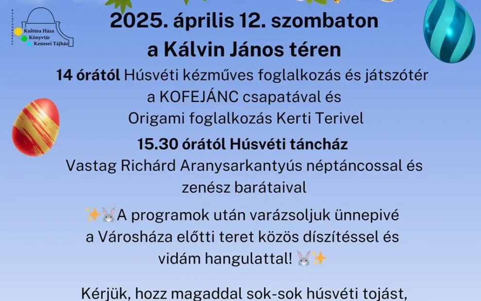Szeretettel várunk Mindenkit április 12-én szombaton 14 órától Húsvéti Családi Délután programunkra. 17 órától díszítsük közösen színes tojásokkal a Városházával…