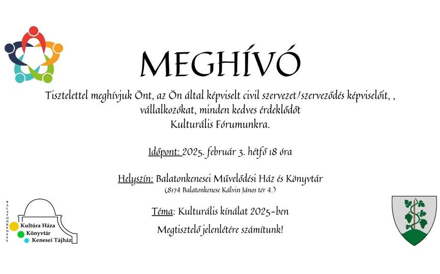 Időpont: 2025. február 3. hétfő 18 óra Helyszín: Balatonkenesei Művelődési Ház és Könyvtár Szeretettel várjuk a helyi közösségeket, kulturális szervezeteket,…
