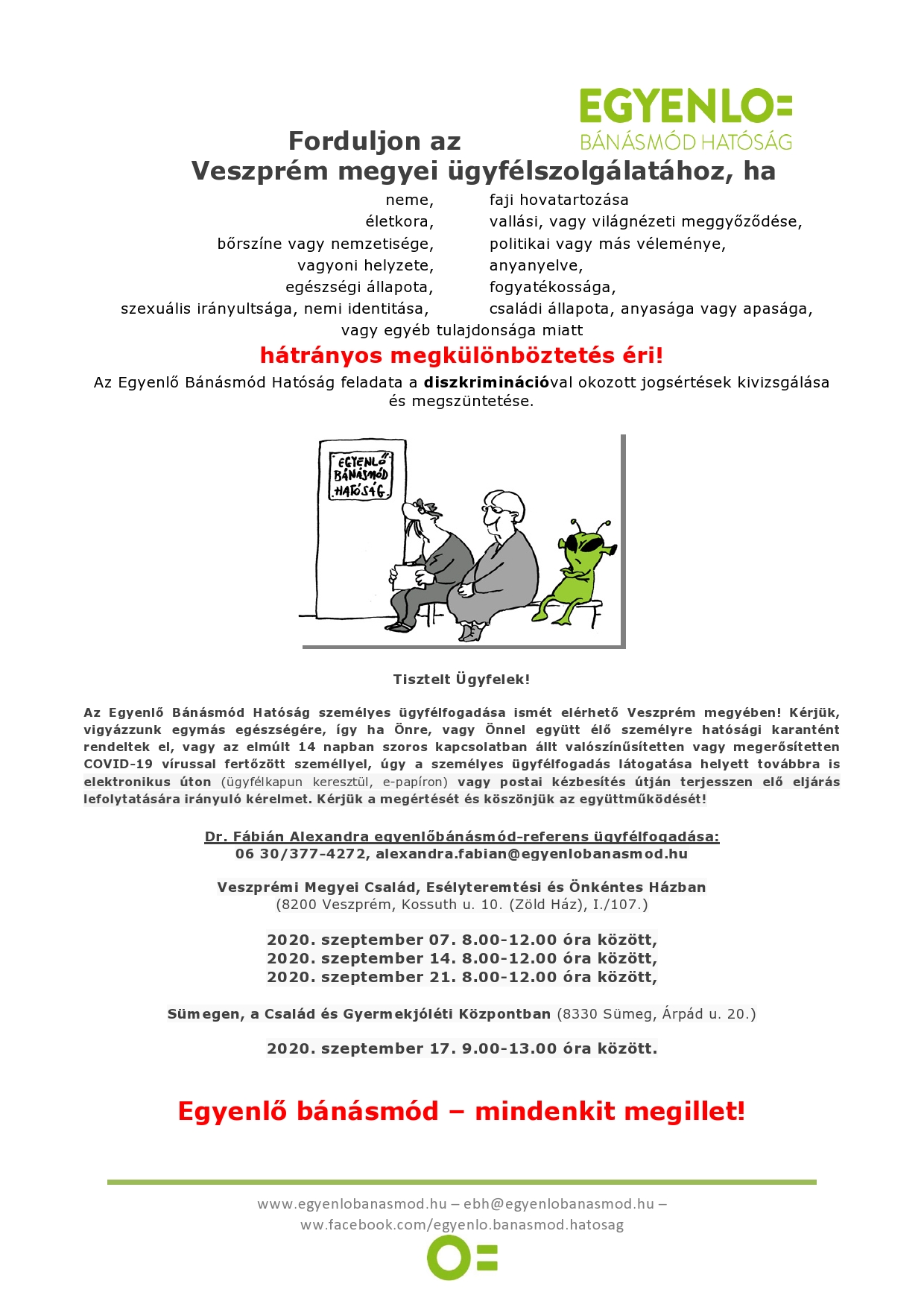 Az Egyenlő Bánásmód Hatóság személyes ügyfélfogadása szeptember hónapban is elérhető Veszprém megyében!