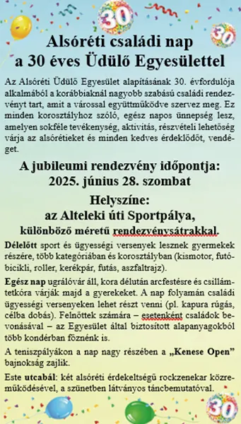Ebben az évben kerek évfordulóhoz érkezett az Alsóréti Üdülő Egyesület. A harminc évvel ezelőtt, 1995-ben 97 fő alapító taggal létrehozott civil szervezet elsődleges célja akkor a Balatonkenese alsóréti üdülőterületén lévő szabadstrand megtartása volt, de általános célkitűzésként a nyaralótulajdonosok mindenkori érdekképviseletét fogalmazták meg. Ezt az Egyesület a város céljainak és érdekeinek figyelembevételével valósítja meg. Jelenlegi taglétszáma 550 fő, ez az alsóréti ingatlantulajdonosok 44%-a, ami jelentős társadalmi beágyazottságot mutat.