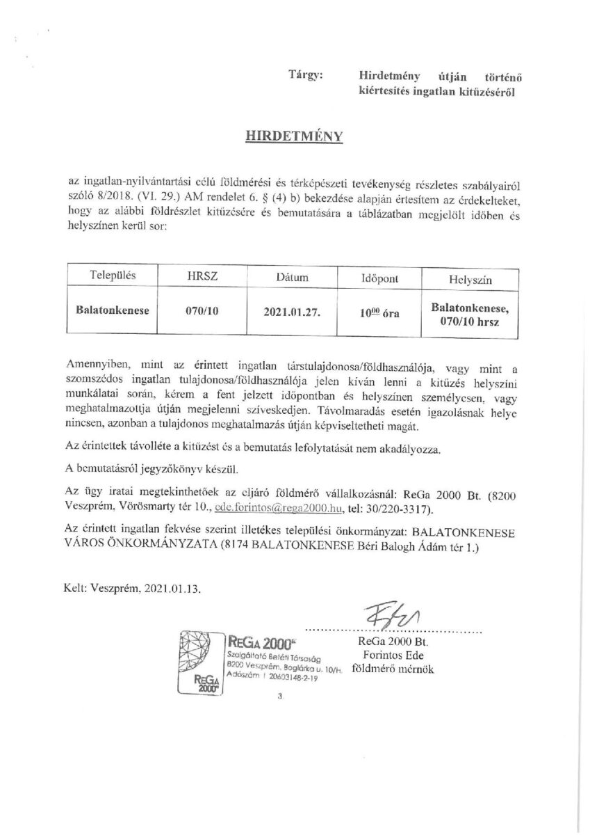 Hirdetmény útján történő kiértesítés Balatonkenese, 070/10 hrsz. ingatlan kitűzéséről. Részletek a letölthető dokumentumban! Kategória: Hírek / aktualitásokBy Kenese Web2021-01-19 Megosztás Share on WhatsAppShare on WhatsApp Share on LinkedInShare on LinkedIn Pin itShare on Pinterest Share on XShare on X Share on FacebookShare on Facebook Post navigationElőzőPrevious post:ÁlláspályázatKövetkezőNext post:Vasúti átjáró lezárásaHasonló bejegyzésekTÁJÉKOZTATÁS SZOCIÁLIS CÉLÚ TŰZIFA TÁMOGATÁSRÓL2025-10-01Felhívás2025-10-01Költözéssel nem járó lakcímváltozásról szóló határozat2025-06-13Költözéssel nem járó lakcímváltozásról szóló határozat2025-06-13Házszám megállapítási határozat2025-06-13Házszám megállapítási határozat2025-06-13