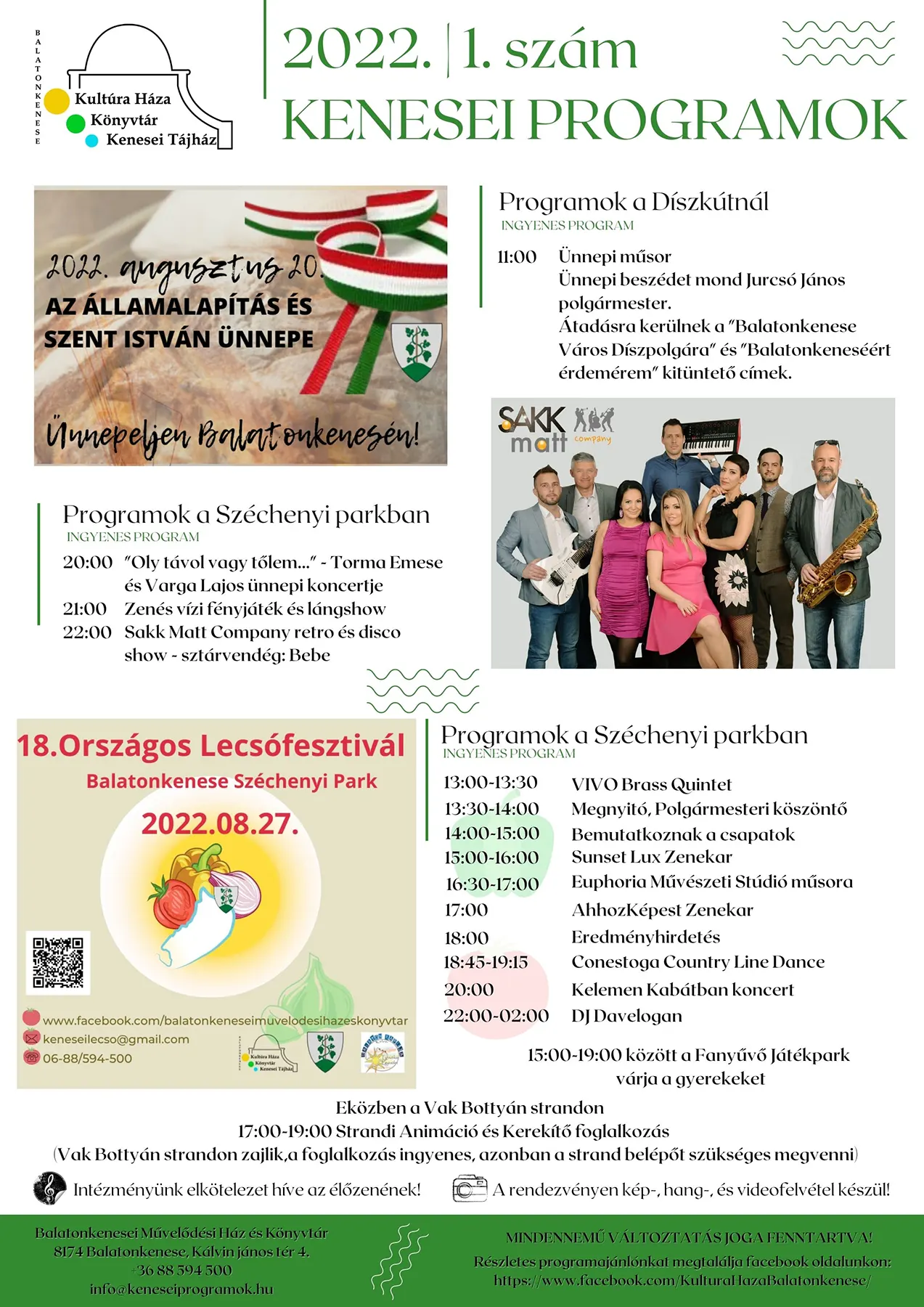 Balatonkenesei Művelődési Ház és Könyvtár Nagy szeretettel várjuk Önöket augusztusi programjainkon! Kategória: Hírek / aktualitásokBy Kenese Web2022-08-15 Megosztás Share on WhatsAppShare on WhatsApp Share on LinkedInShare on LinkedIn Pin itShare on Pinterest Share on XShare on X Share on FacebookShare on Facebook Post navigationElőzőPrevious post:Tájékoztatás I. számú orvosi szolgálat rendelési idejének módosulásárólKövetkezőNext post:ÁlláspályázatHasonló bejegyzésekTÁJÉKOZTATÁS SZOCIÁLIS CÉLÚ TŰZIFA TÁMOGATÁSRÓL2025-10-01Felhívás2025-10-01Költözéssel nem járó lakcímváltozásról szóló határozat2025-06-13Költözéssel nem járó lakcímváltozásról szóló határozat2025-06-13Házszám megállapítási határozat2025-06-13Házszám megállapítási határozat2025-06-13