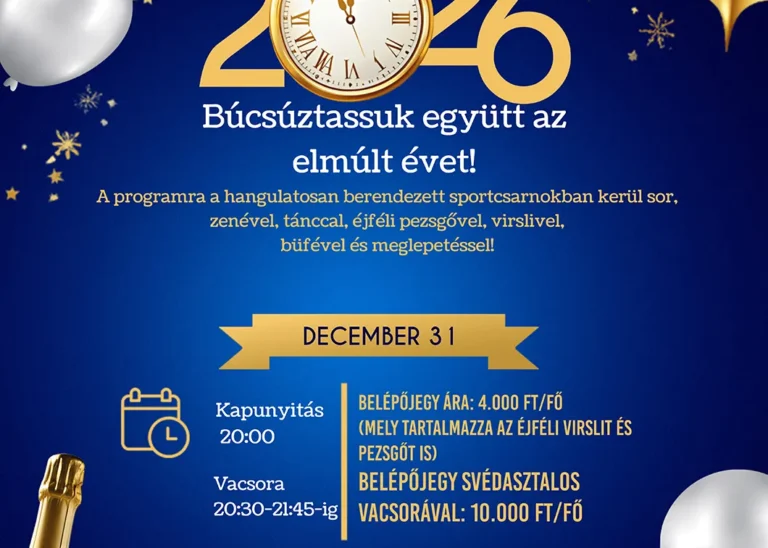 Töltsük együtt az év utolsó estéjét és köszöntsük együtt az új évet éjfélkor! 2025. december 31. 19 óra Helyszín: Sportcsarnok Belépőjegyes, infók a plakáton!
