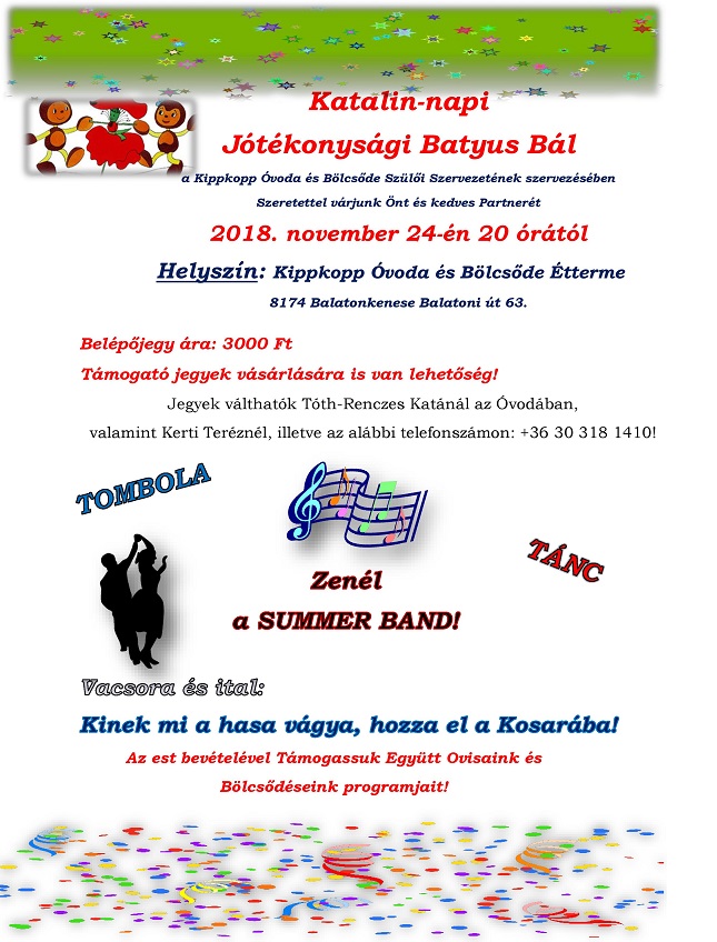 A Kippkopp Óvoda és Bölcsőde Szülői Szervezetének szervezésében szeretettel várjuk Önt és kedves Partnerét 2018. november 24-én 20 órától a Katalin – napi Jótékonysági Batyus Bálunkra a Kippkopp Óvoda és Bölcsőde Éttermébe (8174 Balatonkenese, Balatoni út 63.)