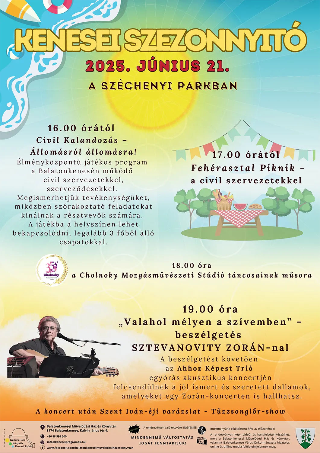 Nyissuk meg az idei szezont, a programok sorát a legnagyobb művészek egyikével, Sztevanovity Zoránnal. Tóth Csaba szervezésének és a művésszel való ismeretségének köszönhetően lép fel a kenesei színpadon Zorán. A délután során a civil szervezeteké lesz a főszerep, valamint a játékos kedvű csapatoké, akik felfedezik a város értékeit.