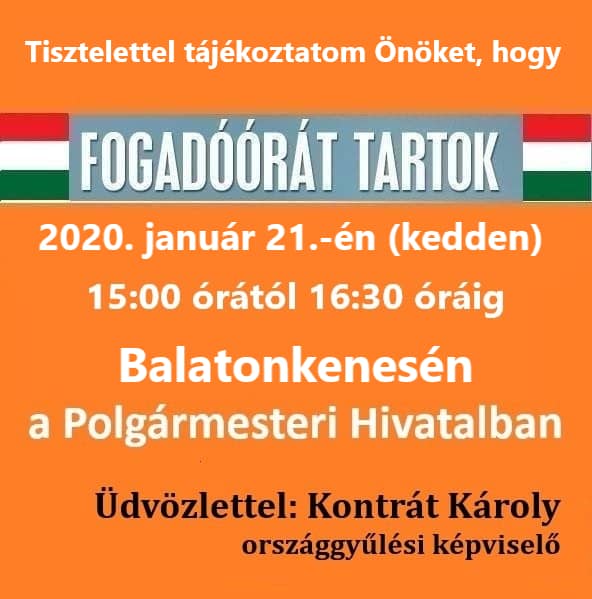 Kontrát Károly országgyűlési képviselő fogadóórája január 21-én, kedden 15.00 órakor kezdődik Balatonkenesén a polgármesteri hivatalban.