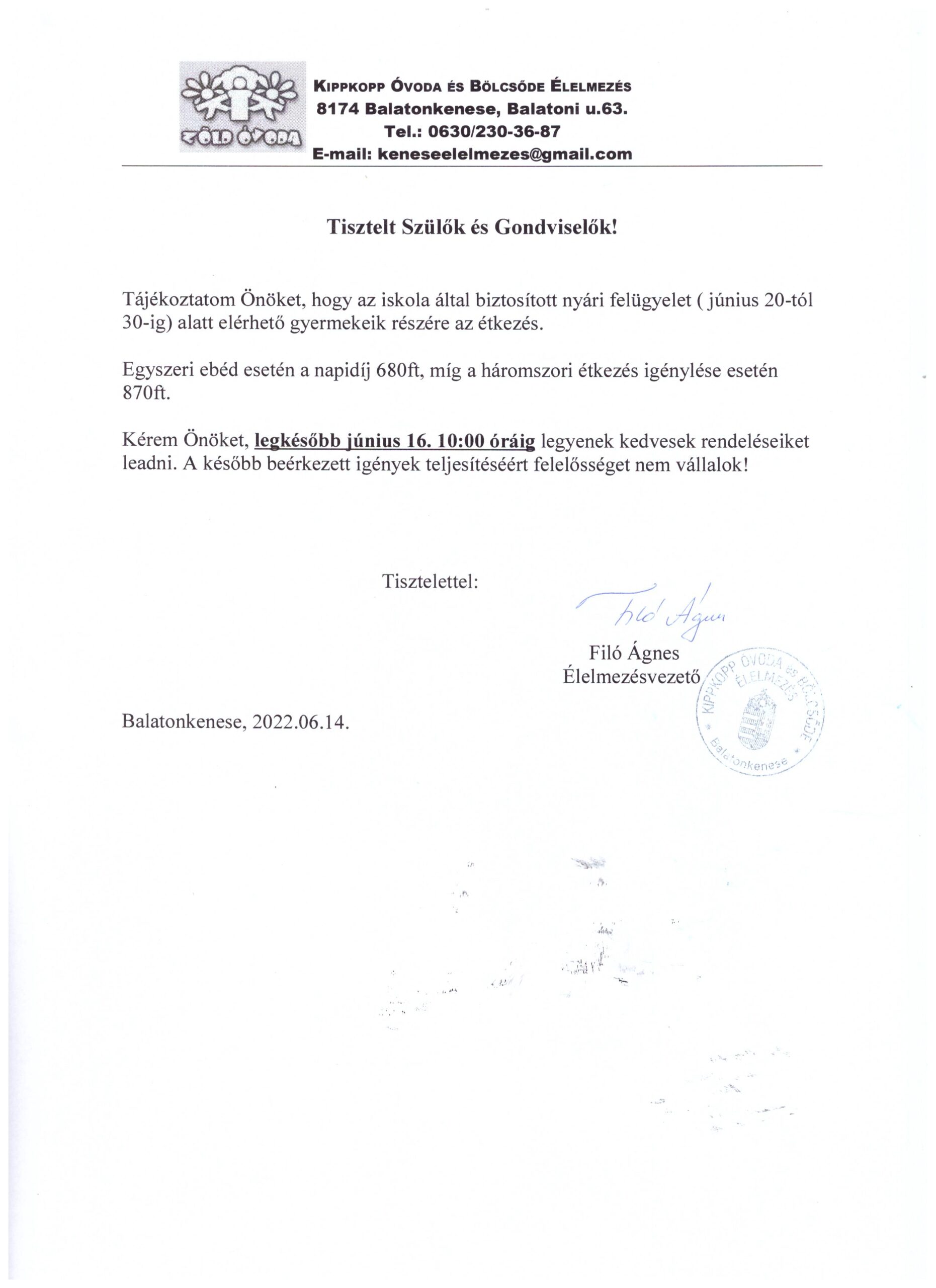 Tájékoztatjuk Önöket, hogy a nyári felügyeletet igénylő iskolások részére elérhető az étkezés 2022. június 20. és 2022. június 30. között.