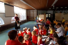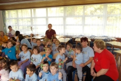Az Ünnepség folytatása képpen a gyermekek vállára akasztottuk a ballagási tarisznyákat, majd a Szülői Munkaközösség elnöke, Tóth-Renczes Katalin átadta az óvodások számára az ajándék tornazsákokat, amelyen minden gyermek óvodai jele szerepelt, majd az óvoda dolgozóinak egész éves munkáját egy-egy virággal köszönte meg.