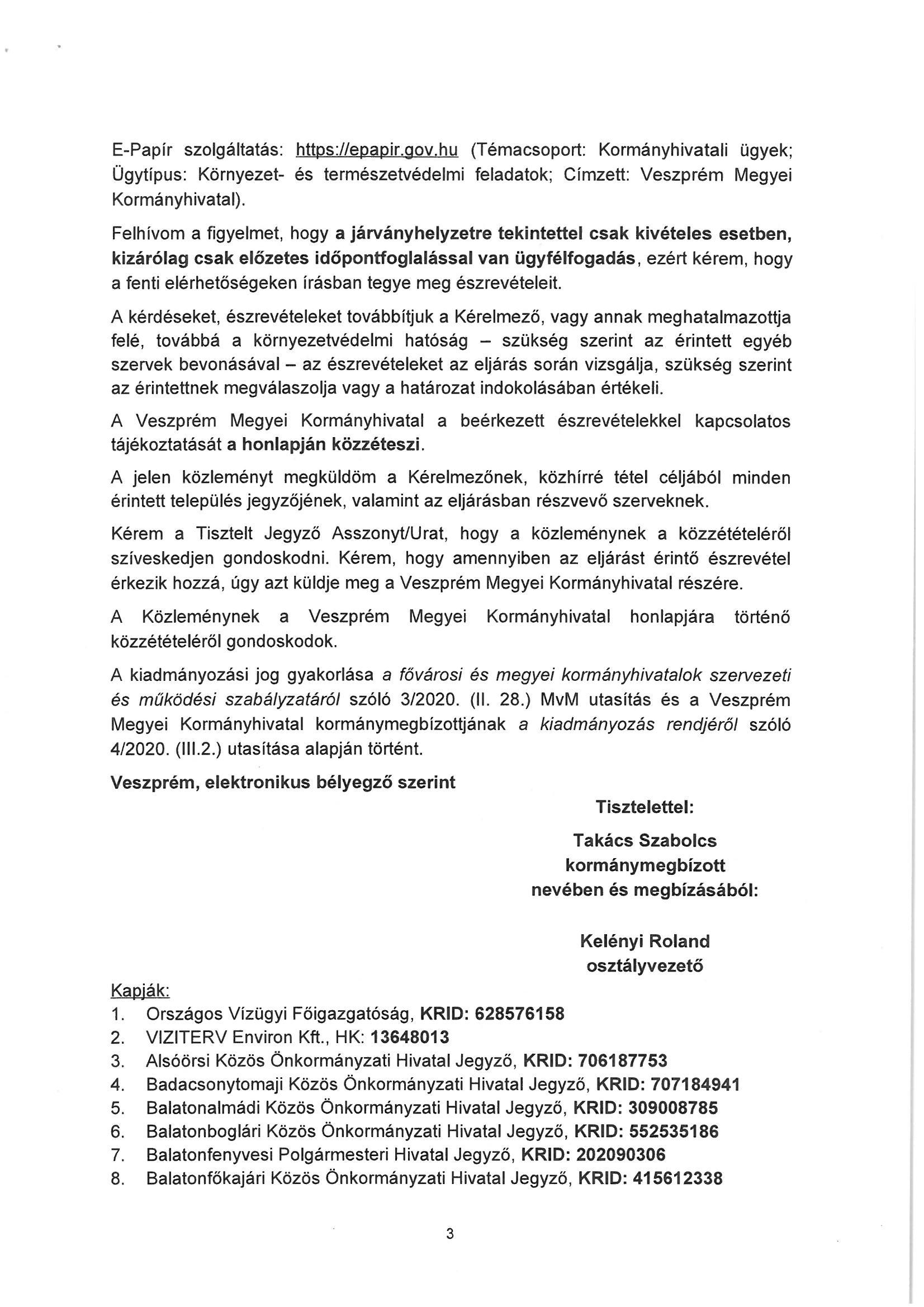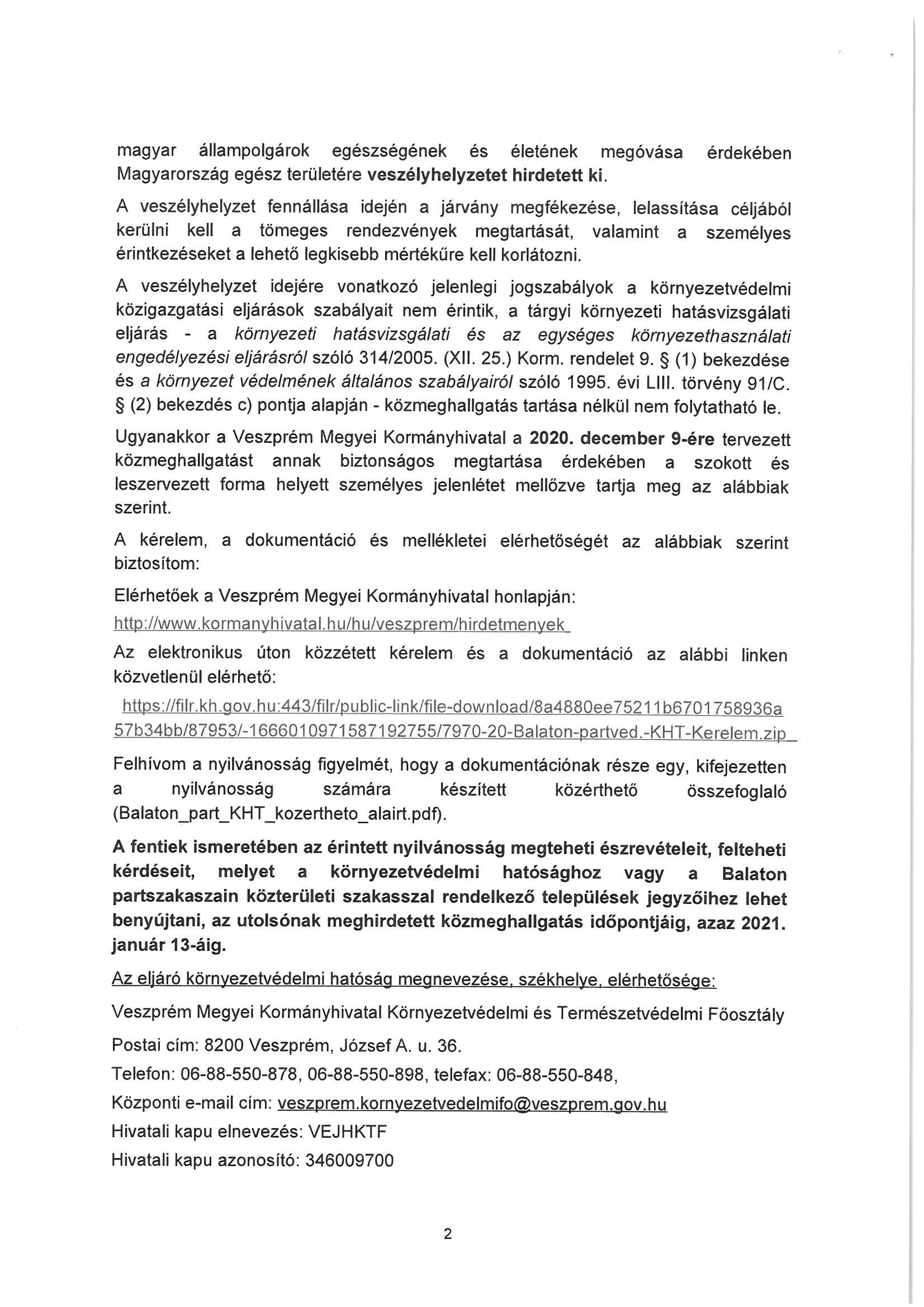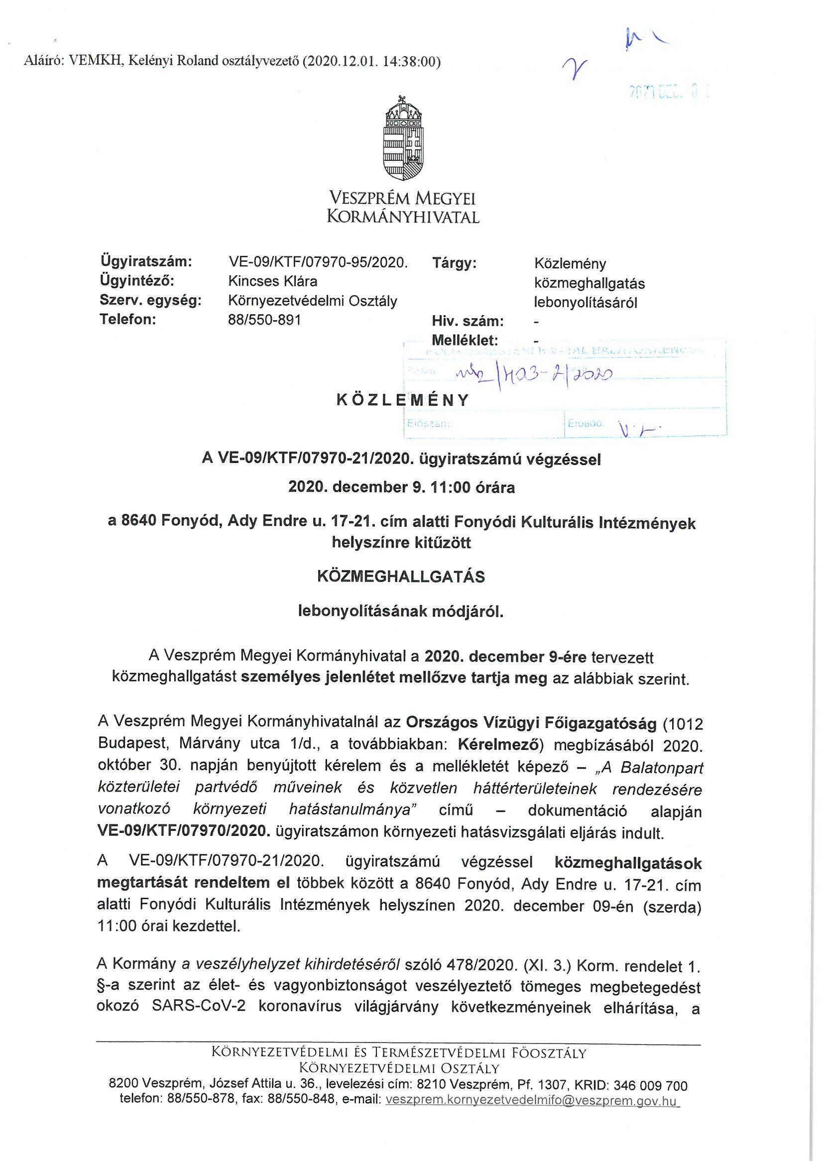 A Veszprém Megyei Kormányhivatal Közleményt adott ki VE-09/KTF/07970-21/2020. ügyiratszámú végzéssel, 2020. december 9-én 11.00 órára Közmeghallgatás lebonyolításának módjáról. A részletek a letölthető dokumentumban olvashatóak.