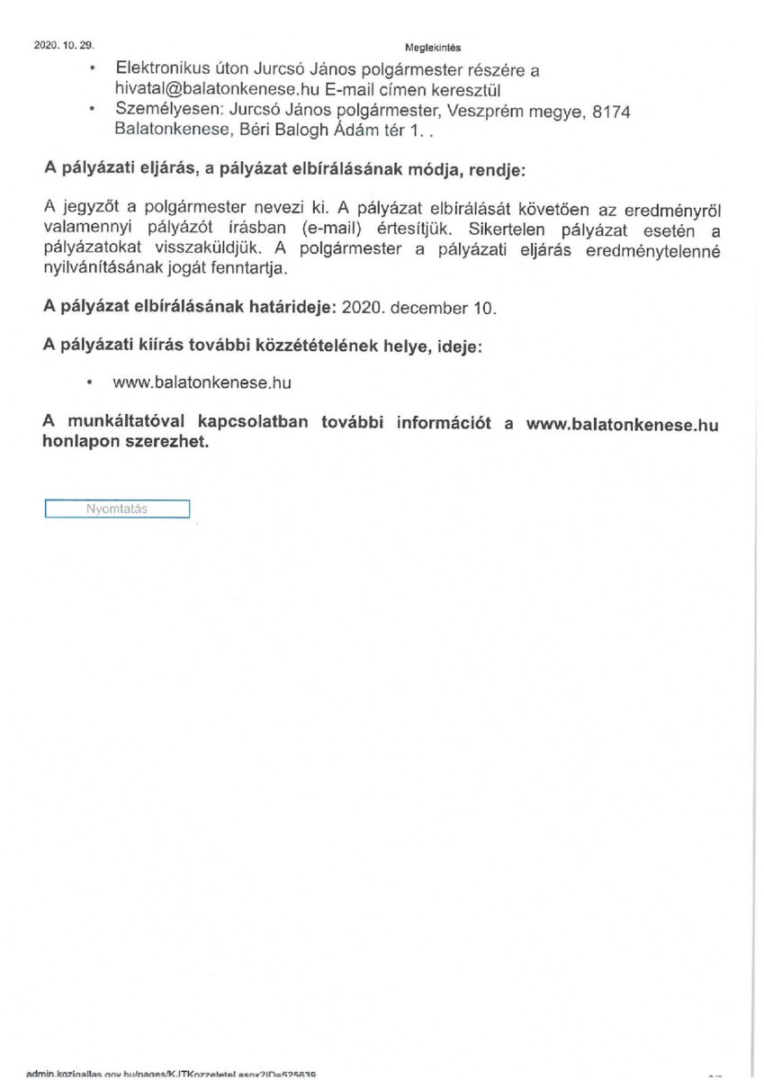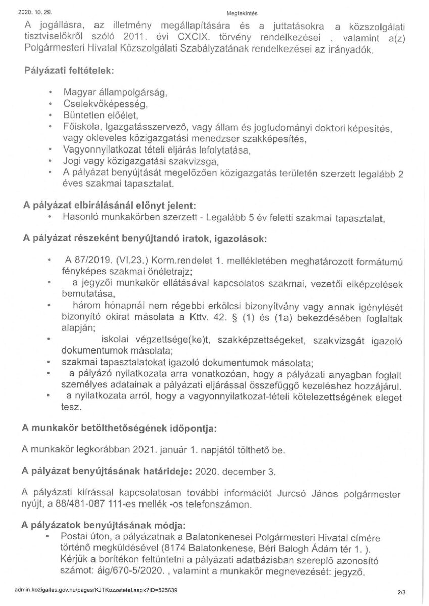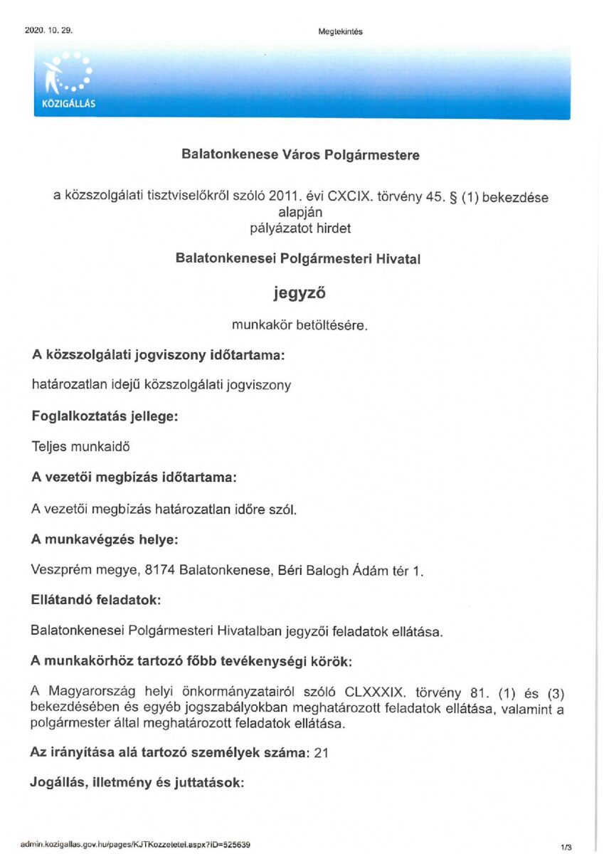 Balatonkenese Város Polgármestere pályázatot hirdet Balatonkenese Polgármesteri Hivatal Jegyző munkakör betöltésére.