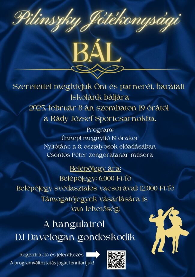 Szeretettel várunk Mindenkit február 8-án a Balatonkenesei Pilinszky János Általános Iskola jótékonysági báljára. Jelentkezni az alábbi Google Forms linken lehet: https://forms.gle/b3bzFxTwS2bU5ET88 Támogatójegyek vásárlására is van lehetőség! Várunk mindenkit szeretettel!