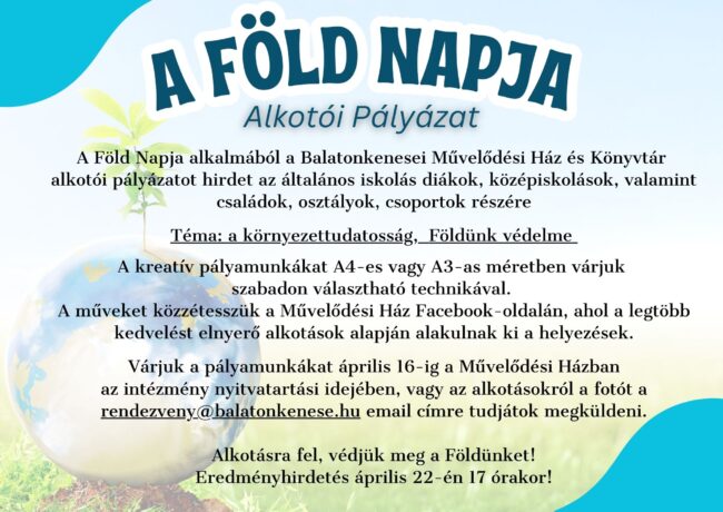 A Balatonkenesei Művelődési Ház és Könyvtár alkotói pályázatot hirdet a Föld Napja alkalmából! Várjuk az általános iskolásokat, középiskolásokat, valamint családok, osztályok és baráti csoportok kreatív munkáit! Téma: Környezettudatosság, Földünk védelme…