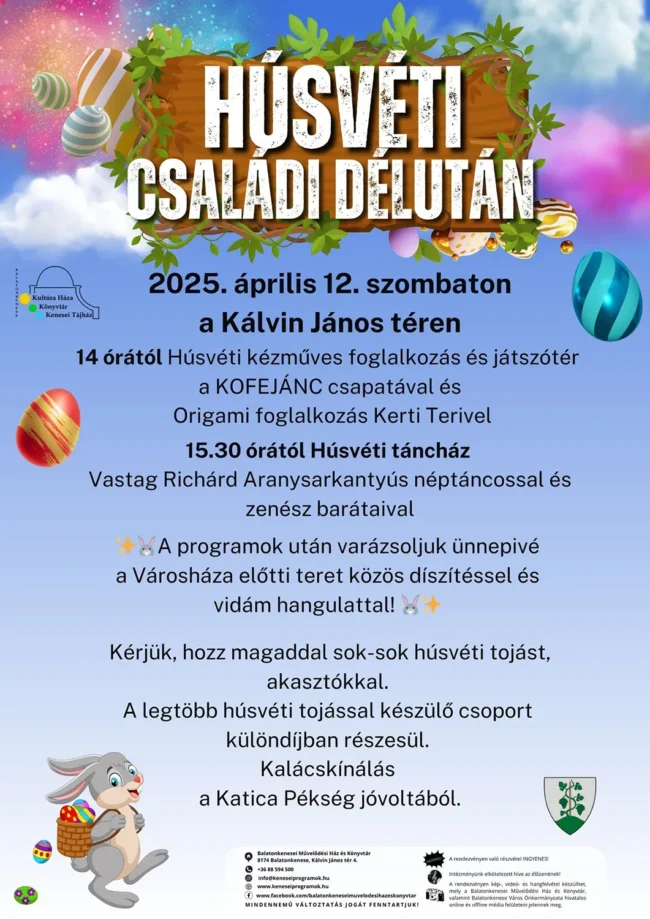 Szeretettel várunk Mindenkit április 12-én szombaton 14 órától Húsvéti Családi Délután programunkra. 17 órától díszítsük közösen színes tojásokkal a Városházával szembeni teret!