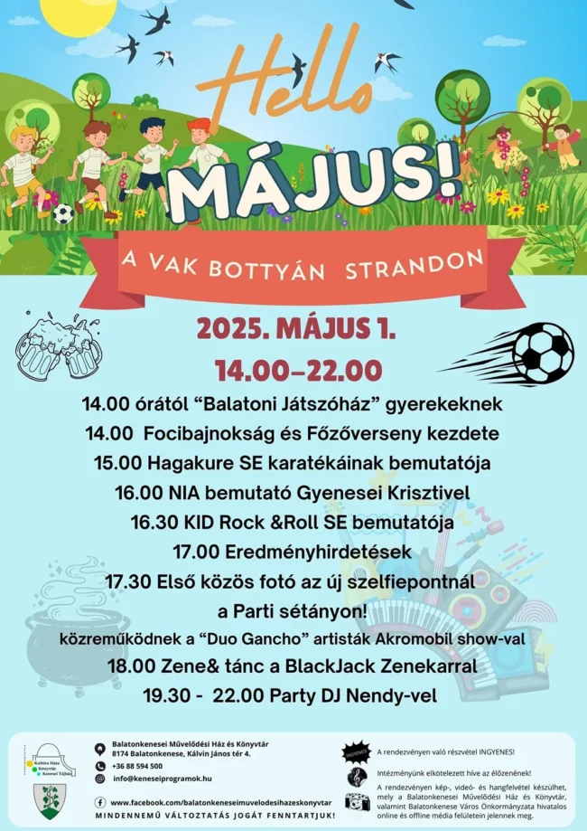 A Majális ismét visszatért a kenesei nagy strandra (Vak Bottyán strandra). Várjuk a családokat, baráti társaságokat, mindenkit, akinek sétálgatni támad kedve a partra, a strandra. vidám programok, finom falatok és…