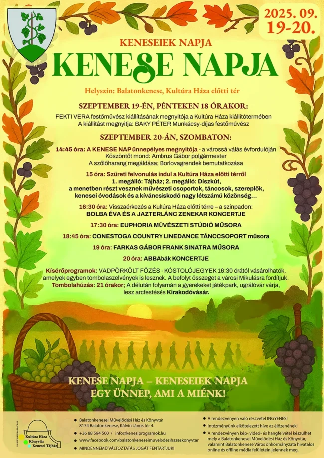 Ismét újabb, színes közösségi eseményre készülünk! Kérjük a jelentkezéseket a vadpörkölt főzésre és várunk mindenkit a szüreti felvonulással kiegészített, hagyományos KENESE- NAPRA!