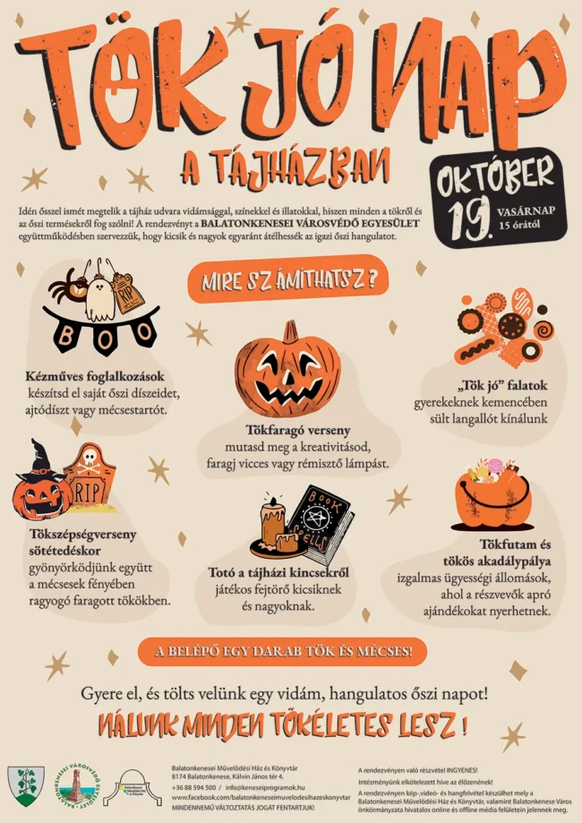 Október 19-én, vasárnap 15 órától várjuk a Tök Jó Napra érkező vendégeket a Tájházba (Kossuth u. 6.). Izgalmas őszi kavalkád lesz, főszerepben mindannyiunk kedvencével, a tökkel.