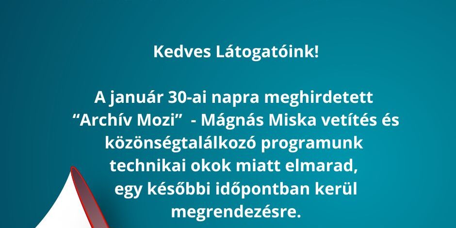 A 2025. január 30-ai napra meghirdetett „Archív Mozi” – Mágnás Miska filmvetítés és közönségtalálkozó technikai okok miatt elmarad, egy későbbi időpontban kerül megrendezésre.