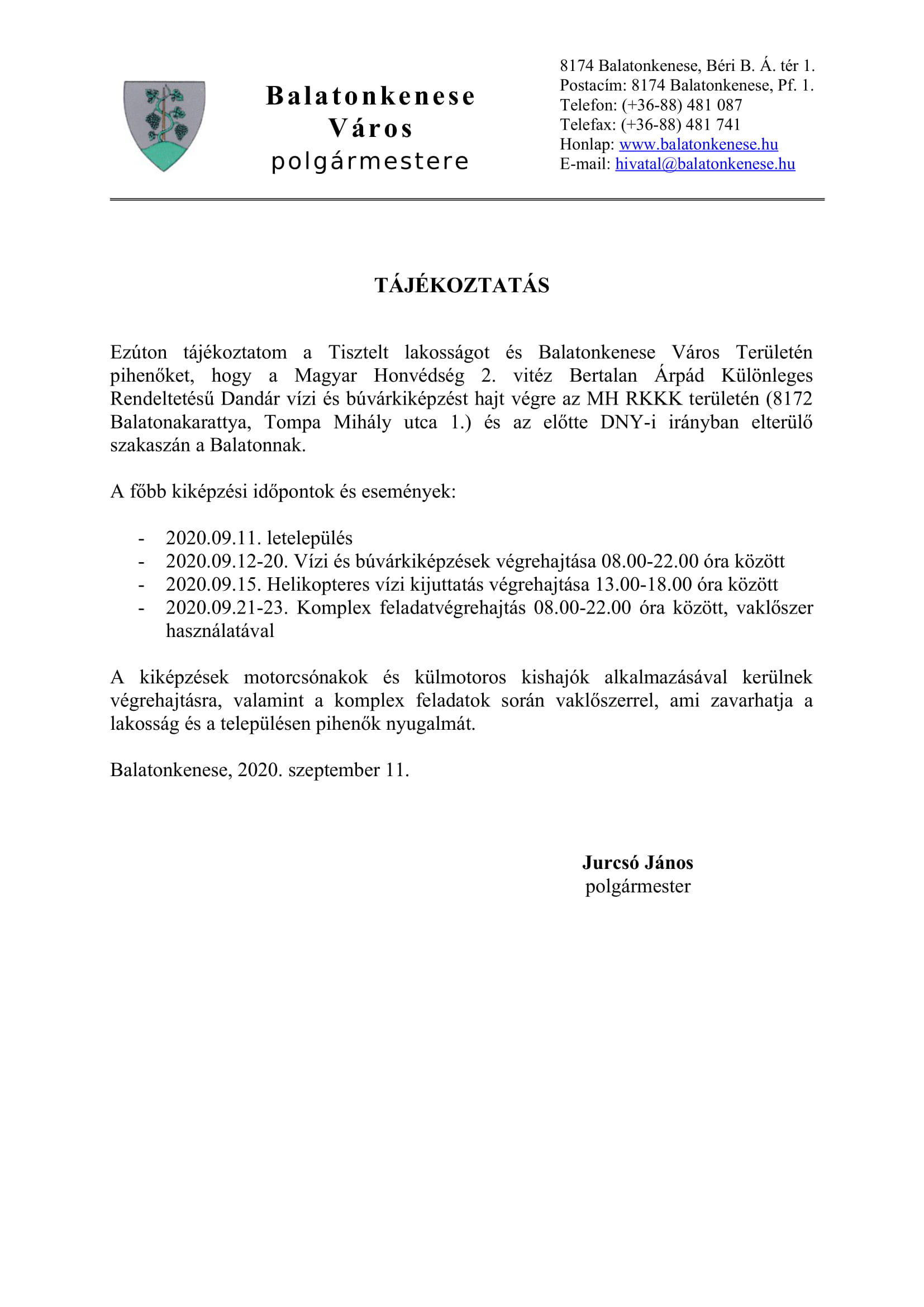 2020.09.12-20. Vízi és búvárkiképzések végrehajtása 08.00-22.00 óra között