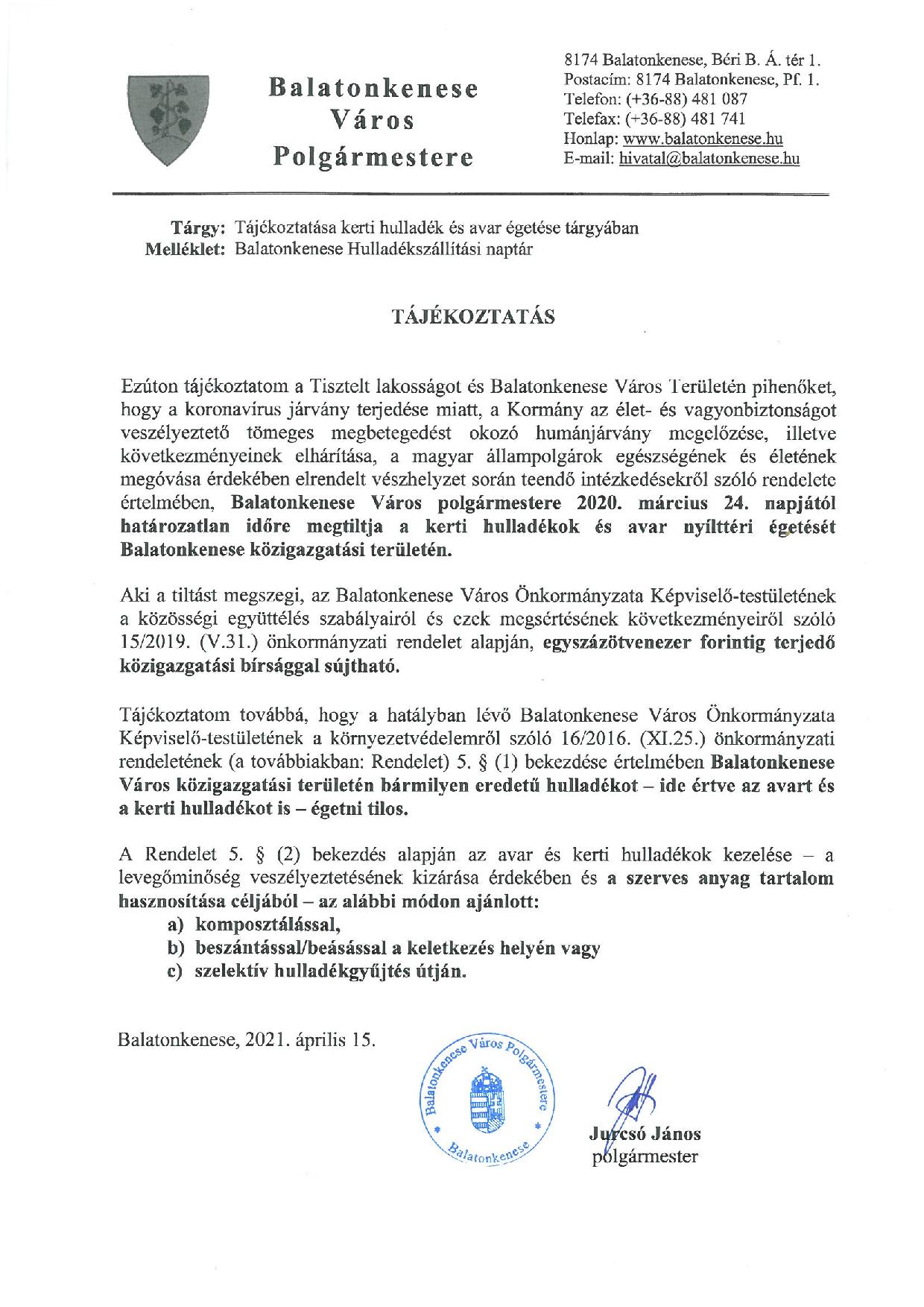2020. március 24-től határozatlan ideig Balatonkenese Város közigazgatási területén tilos bármilyen eredetű hulladék – beleértve az avar és a kerti hulladék – nyílt téri égetése.