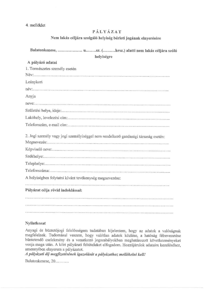 - Pályázat benyújtásának módja: A pályázatot az erre rendszeresített nyomtatványon (lakásrendelet 4. melléklete itt letölthető) írásban kell benyújtani személyesen vagy meghatalmazott útján a Balatonkenesei Polgármesteri Hivatal titkárságán, vagy postai úton. A pályázatnak tartalmaznia kell az alábbiakat: