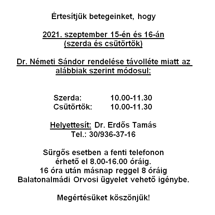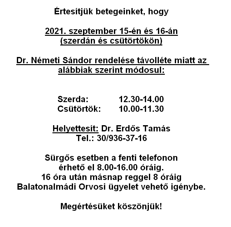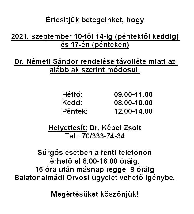 2021 szeptemberi hónapban az alábbiak szerint módosulnak a rendelési idők. 2021. szeptember 8-9. 2021. szeptember 10-14. 2021. szeptember 17. 2021. szeptember 15-16. Kategória: Hírek / aktualitásokBy Kenese Web2021-09-07 Megosztás Share on WhatsAppShare on WhatsApp Share on LinkedInShare on LinkedIn Pin itShare on Pinterest Share on XShare on X Share on FacebookShare on Facebook Post navigationElőzőPrevious post:Tájékoztató vasuti útátjáró lezárásárólKövetkezőNext post:Meghívó Lakossági FórumraHasonló bejegyzésekTÁJÉKOZTATÁS SZOCIÁLIS CÉLÚ TŰZIFA TÁMOGATÁSRÓL2025-10-01Felhívás2025-10-01Költözéssel nem járó lakcímváltozásról szóló határozat2025-06-13Költözéssel nem járó lakcímváltozásról szóló határozat2025-06-13Házszám megállapítási határozat2025-06-13Házszám megállapítási határozat2025-06-13