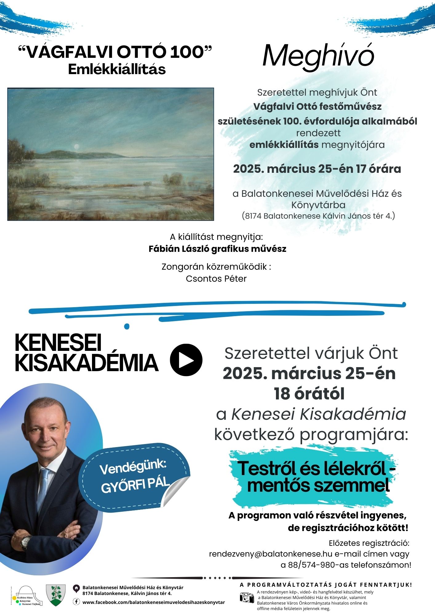 Két nagyszerű programra hívjuk és várjuk az érdeklődőket március 25-én délután, este. Örömünkre szolgál, hogy a szomszéd város nagyrabecsült festőművészének, Vágfalvi Ottónak emlékkiállítását nálunk tarthatjuk. A sokak által ismert és tisztelt művész az idei évben lenne 100 éves. Fábián László, a Balatonalmádiban élő grafikusművész örömmel vállalta a tárlat megnyitását, hiszen ifjú korában Ottó bácsi indította el a művészi pályafutását.